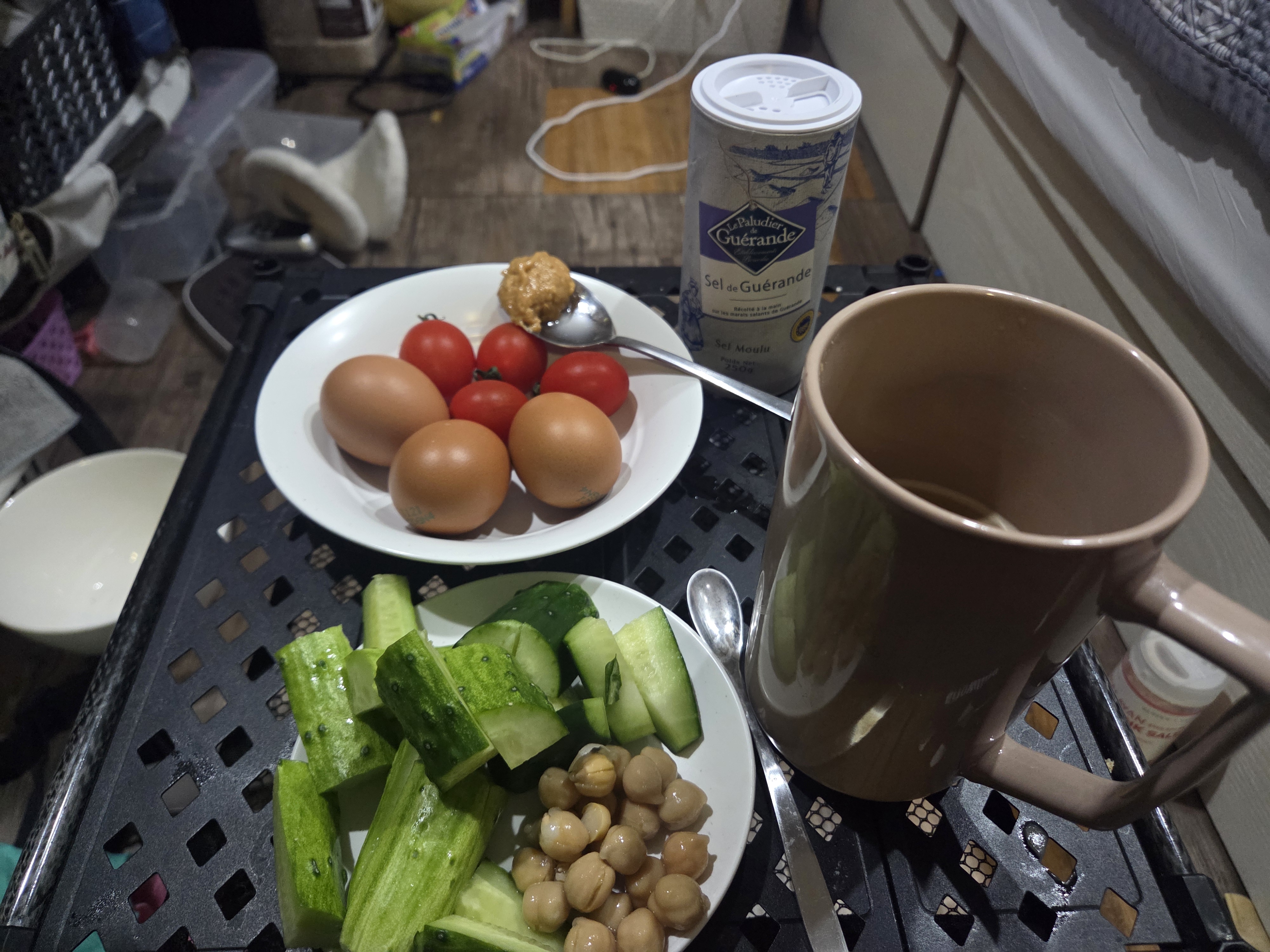 황태해장국(블럭국 + 황태채 + 계란 1개)를 넣고 메인으로 삶은계란2개, 땅콩버터, 오이, 샐러드, 방울토마토!